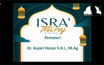 Narasumber pada peringatan Isra Mi'raj kali ini ialah Dr. Asyari Hasan, SHI, M.Ag (Sekretaris Program Studi S2 Perbankan Syariah). Pada paparannya, Dr. Asyari Hasan menyampaikan bahwa peristiwa Isra dan Mi'raj tidak bisa dimaknai secara logika semata, tetapi harus dimaknai secara keimanan. Perintah kewajiban shalat lima waktu bagi umat Rasulullah SAW diturunkan pada saat perjalanan Isra Mi'raj ini