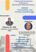Sabtu, 21 November 2020 program studi ekonomi pembangunan Fakultas Ekonomi dan Bisnis Universitas Islam Negeri (UIN) Syarif Hidayatullah Jakarta mengadakan seminar kewirausahaan. Kegiatan ini ditujukan bagi dosen, mahasiswa, dan alumni dari Fakultas Ekonomi dan Bisnis UIN Syarif Hidayatullah Jakarta. Wakil Dekan Bidang Kemahasiswaan, Alumni, dan Kerjasama Prof. Dr. M. Nur Rianto Al Arif, M.Si menyambut baik kegiatan seminar kewirausahaan ini sebagai upaya untuk menumbuhkembangkan jiwa kewirausahaan di sivitas akademik FEB UIN Syarif Hidayatullah Jakarta.